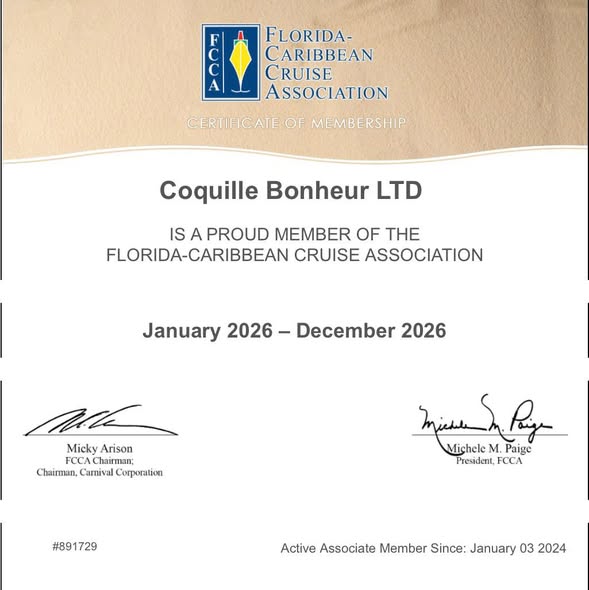 Coquille Bonheur Ltd. proudly reaffirms its continued membership with the Florida-Caribbean Cruise Association (FCCA) for 2026. As a committed member of this prestigious organization, we remain dedicated to upholding the highest standards of quality, professionalism, and service excellence within the cruise industry.