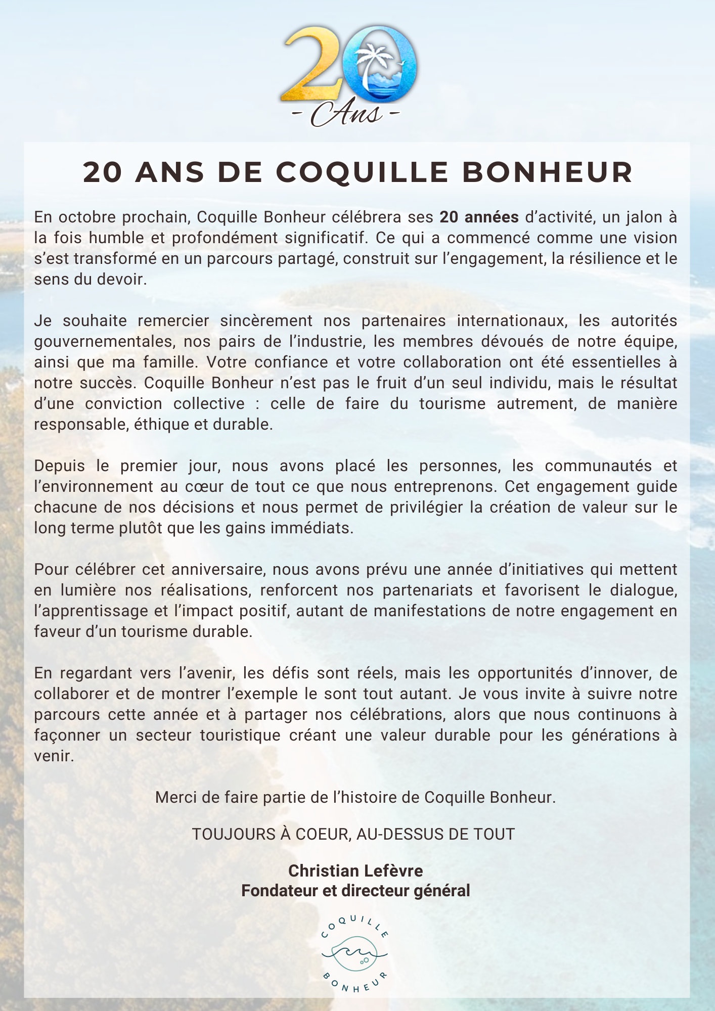Il y a vingt ans, Coquille Bonheur est née d’une vision simple.Aujourd’hui, elle incarne une aventure collective portée par les personnes, le sens et le care.