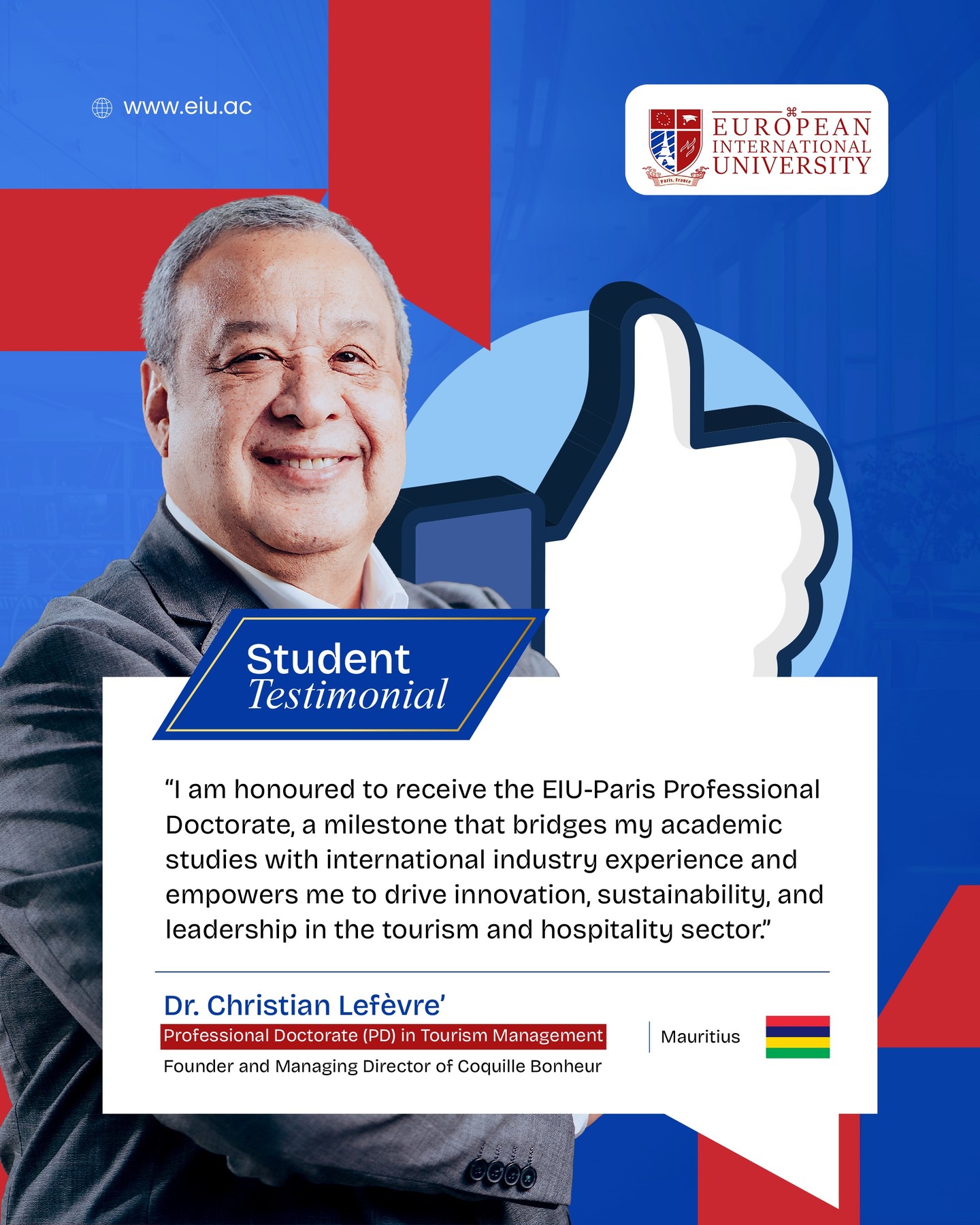 A true leader in tourism and hospitality, Dr. Christian Lefèvre reflects on how the EIU-Paris Professional Doctorate bridges academic rigor with real-world international experience—empowering innovation, sustainability, and leadership on a global stage.
